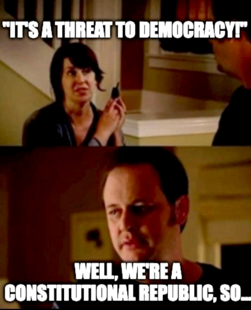 The Talking Heads on the News, are lying to the American People every day. These people are nothing more than paid actors, reading a Cabal Script. By getting the masses to believe we are a democracy is an effort to move away from the electoral college. Which would be more dangerous. Democracy is MOB RULE. With no checks or balances. Why Democracy is a bad thing, simply illustrated: