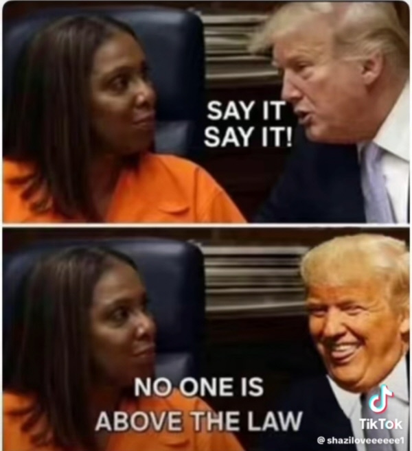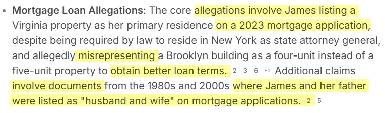 When Letitia was campaigning to be elected Attorney General of New York, her campaign mantra was: She never said what she would charge him with, and when asked, she would respond: "Nobody is above the law" Eventually, Letitia indicted Trump on "Civil Fraud", claiming that he over-estimated the value of his properties to secure a loan from a bank. The Banks representative testified that they estimated the Trump properties as being worth more than what Trump claimed on the loan application. That Trump never missed a payment, never was late on a payment, and eventually paid off the loan in good standing. There was no victim. There was no fraud. Trump was fined $450 Million, but appealed that decision to a higher court and the case dismissed. Fast forward to 2024, and Letitia is being investigated for Mortgage Fraud.