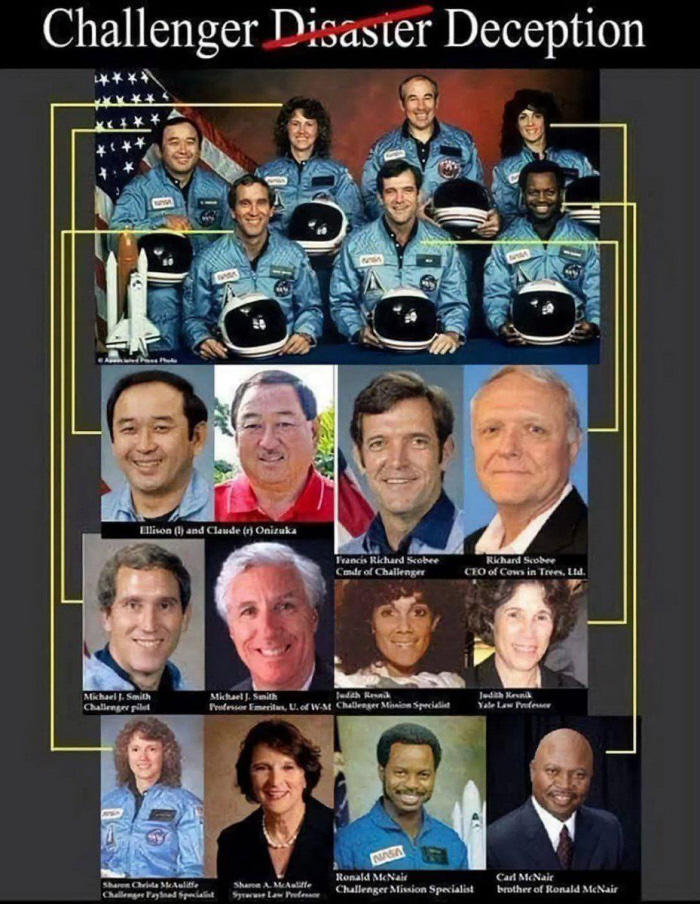 Interestingly, every member of the tragic Challenger explosion has a doppelganger (a look-alike) that coincidentally has the exact same name and birthdate and is still alive today...
