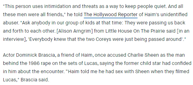 Cory Feldman Speak Out (65 Seconds) Download this video: Right Click and select "Save Link As..." There are countless stories coming out to the point that the media has to cover it; however, it is still being treated as if this sick perversion is a one off and not industry wide. Watch, "Quiet on the Set," the Nickelodeon documentary. Look into Amanda Bynes, Drake Bell, or any number of the people who have come out about the horrors they witnessed or endured as child actors, only to be labeled as "drug addicted" or "mentally ill" and lose their jobs or status- or worse. The list is long; the truth is right before our eyes, all we have to do is open them and see. Some child actors are sex trafficked and grow up with it, they grow up, and if they remain actors, it is said that many carry on with the adrenochrome and child sex trafficking. It is an open secret in Hollywood. Others who are new to Hollywood may never make it big unless they too get involved and take part. Isaac Kappy