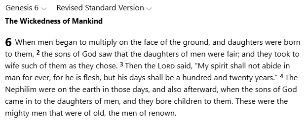 wives, their offspring were called Nephilim. They were half divine and half human. They were men of renown. They were giants.