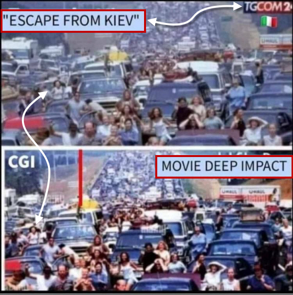 TGCOM News Station showed the top picture on their channel and reported this as live footage from Kiev, Ukraine. The bottom picture is a clip from the movie "Deep Impact." The unsuspecting public buys into this and doesn't question the media. That needs to change.