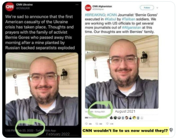 Poor Bernie. He was executed by the Taliban in 2021 And then died again in Ukraine from a Russian bomb in 2022. The Cabal loves to show us they are lying. They think we are stupid farm animals and won't catch this. Is Bernie even a real person? Or is he just some image they grabbed to make up this story. If he is real, then why did CNN report his death on two separate occasions? Either CNN is completely inept to have made this mistake, or they are doing it on purpose to laugh at us, the public, who wants to believe the media. It can only be one or the other:
