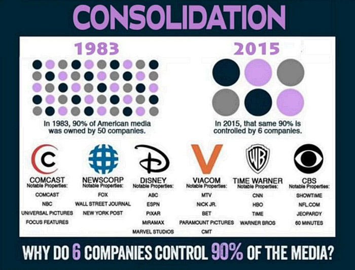 In 1983, 90% of American Media was owned by 50 different companies. In 2015, 90% of American Media was owned by 6 different companies. These 6 media companies are controlled by the Cabal.