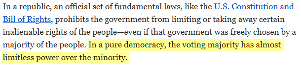 The Talking Heads on the News, are lying to the American People every day. These people are nothing more than paid actors, reading a Cabal Script. By getting the masses to believe we are a democracy is an effort to move away from the electoral college. Which would be more dangerous. Democracy is MOB RULE. With no checks or balances. Why Democracy is a bad thing, simply illustrated: