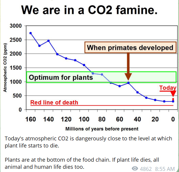 Isn't it odd that after 30 years of ever-present global-warming fear, "Science" has never issued a statement to define when the crisis will be over? That shouldn't be that hard. Something like, When CO2 (Carbon Dioxide) levels in the atmosphere all register below X in 12 locations around the earth, every day, for 3 years in a row, then we have succeeded and the crisis is over. Then the media reports on our progress every day. But this is not happening. It would be very simple to do. Why has the end goal not been defined and communicated? ANSWER: because over the past nine years, CO2 levels have been consistently dropping. If the world knew this, we would stop spending money to fix this invisible (non-existent) problem. The Cabal wants this to continue as it enriches them. Another reason the Cabal wants CO2 levels to be lower is plant life cannot survive without CO2. Trees, plants, and crops all thrive when CO2 levels are higher. Harmony: Plants breathe in CO2 and exhale oxygen. Mammals (Humans) breathe in oxygen and exhale CO2. If there is less CO2, crops will not grow as well... creating food shortages... Rain forests would not thrive. We need CO2 levels to be higher to maintain the balance. Plants thrive when CO2 is high and consume the excess and produce more oxygen. It is a self-balancing system.