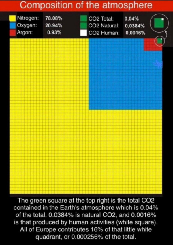 But the powers that be, the Globalists- the Cabal, continue to push for lower and lower carbon levels. We are being told we need to lower our carbon footprint. We are being told that we humans, are the problem. We are being told that if we don't lower our Co2 output, the world will end. Take a look at how much Carbon Dioxoide (Co2) is actually in the atmosphere: