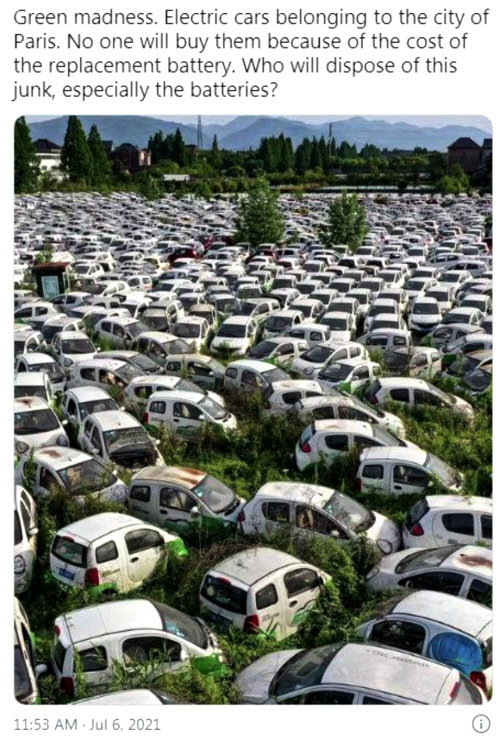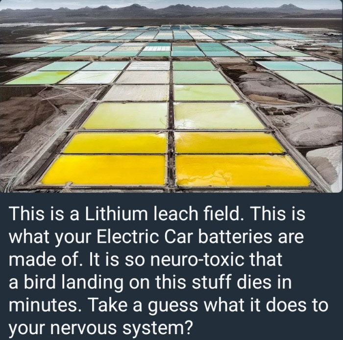 The electric batteries will eventually corrode and leach lithium and other toxins into the soil and eventually the water table. "Follow the Science" needs to also include researching any solution offered to its full environmental impact. (13 seconds) Download this video: Right Click and select "Save Link As..." All the batteries that will be needed for everyone to drive electric cars... Let's look into how Lithium batteries are made and make sure that is a safe process for the environment.