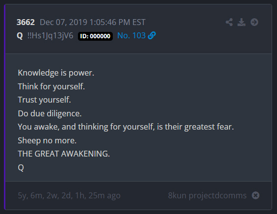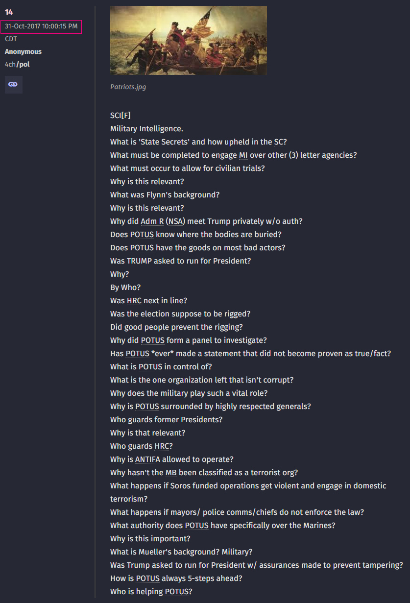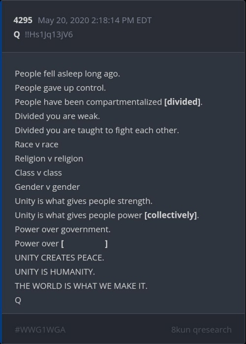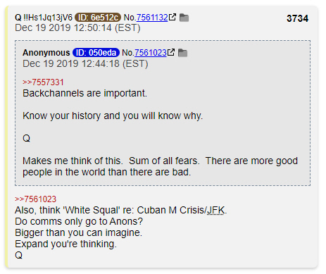 It is believed that the posts above and many similar ones, were meant for operatives in the field (Sleepers) who needed to remain "Radio Silent". It is our guess that these operatives would check the Q posts daily for communications to them and they would interpret these posts and act upon any orders and/or intelligence from these posts.