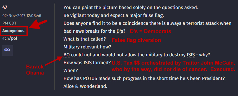 An Anon is a person who follows the Q drops and tries to uncover the truth. All of the information on this website was prompted from the Q drops, researched by Anons, and distributed in video form, meme form, and textual form. Anon is short for Anonymous. Anyone can post a message, and when they do, they post anonymously, and that is what shows up on the board: Anonymous