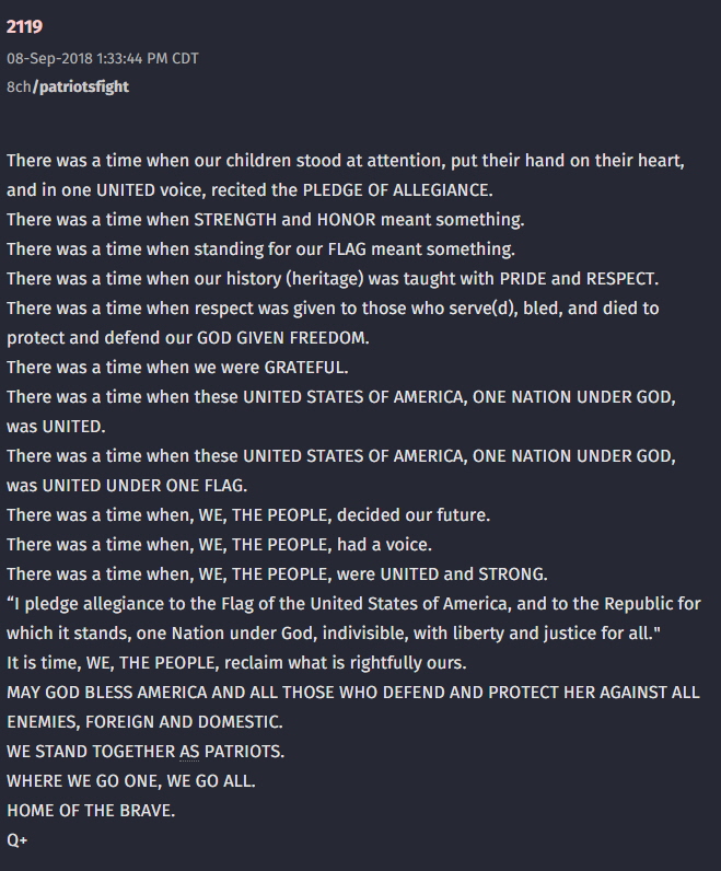 The post above, #2119, was posted on September 8, 2018, but was not signed by Q. It was signed by Q+ instead, which Anons discovered to mean that it was written by Donald Trump.