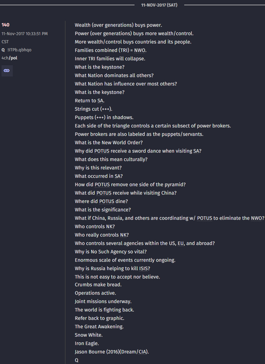 Q started posting after Trump's world tour. It is also believed that when Trump visited Russia, the strings that were controlling Putin were cut,