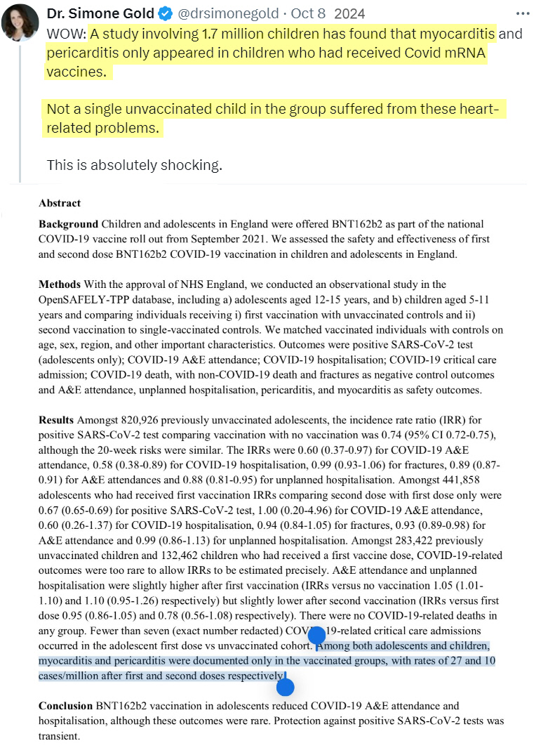 The study Simone Gold is referring to may be read in it's entirety in the following PDF: Effectiveness of COVID-19 vaccination in children and adolescents study Dr. Peter McCullough (2 minutes) Download this video: Right Click and select "Save Link As..." Dr. McCullough recommends three key substances for those seeking recovery after the shots.