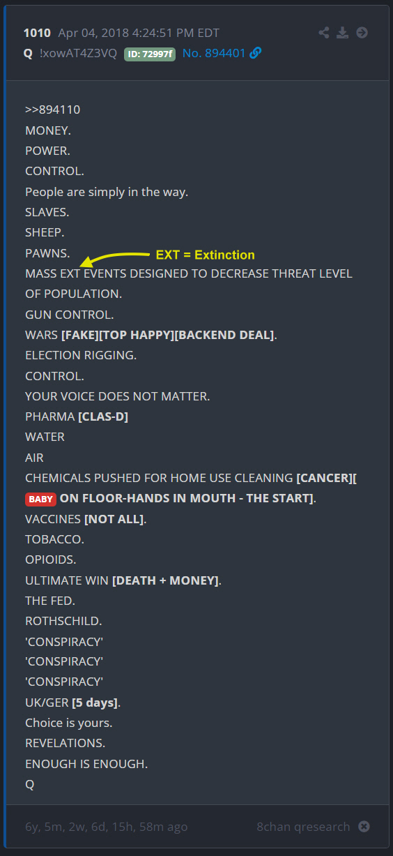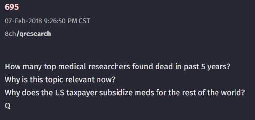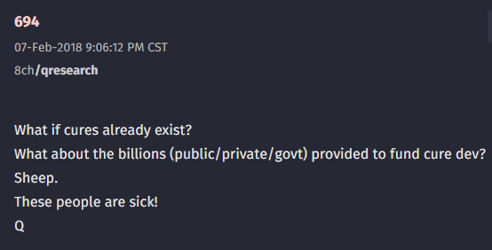 The following Q Drop in 2020, reposted drop 694 from 2 years prior and commented: What if cures already exist? But Big Pharma wants to keep that hidden? What happens when people become aware that cancer is easily cured and prevented, and they begin talking about it on Social Media?