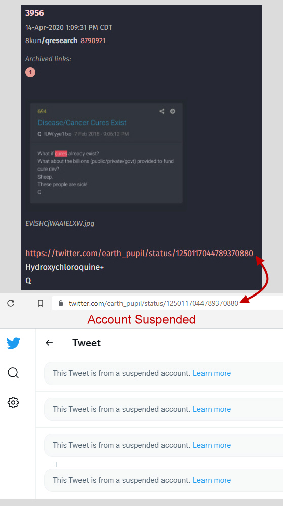 Answer: Their account is suspended. Big Pharma & Big Tech are working together and are a part of the Cabal. They help each other. The Cabal can't allow their sheep (us) to manage our own health care... That wouldn't be profitable for them. So they have Big Tech censor people who are sharing knowledge of simple home cures. In the Q drop above it states: Hydroxychloroquine, according to the NIH,is a potent inhibitor of COVID.