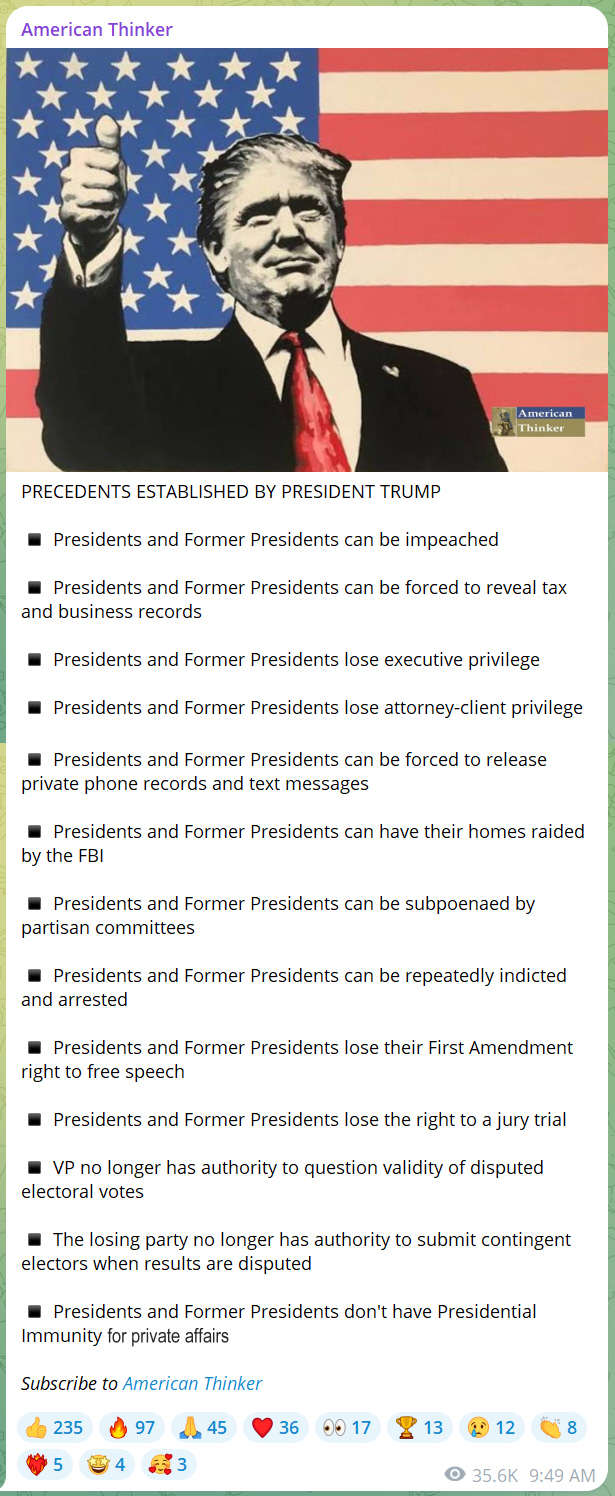 The Boomerang is coming soon. This is where all of the corruption the Deep State engaged in will boomerang back on to them, and the American people will judge them severely. Trump's first term, and then his four-year pause with Biden as the Resident, did the following: 2016 to 2020: Show the American people that we can have Peace on Earth (no wars), prosperity, and fair trade with China. Trump also put certain executive orders in place for future use. 2021 to 2024: Allow the deep state (Biden Admin) destroy the country for the people to compare Trump 4 years to Biden 4 years. During the Biden admin, Trump was setting precedents and forcing the Supreme Court to make rulings on specific topics. Here are the precedents that are now forged forever in our Constitutional Republic: