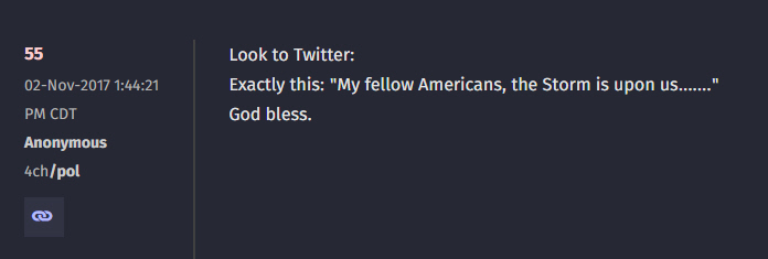 Throughout the Q Drops, there is a constant theme: The Q post above tells us how we will know when the Storm is here. We don't know who will post that phrase. We don't exactly know what the storm will be. It is believed it will be a massive arrest event by the military. We will find out.