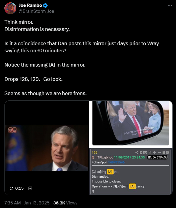 You can watch a short clip of the 60min/Wray interview here: https://x.com/BrainStorm_Joe/status/1878798000526627115?t=mz4tF51mk_3umwuTYfs2vg&s=09&mx=2 In the 60 minute interview, Wray says the exact same message. "Objects in mirror are closer than they appear". The closing act is upon us. If you are just learning about Q now, then these Deltas may not be all that interesting to you. But they are important to the Anons. Anons are constantly being ridiculed by "Normies" and the mainstream media. Soon, the normies will wake up and mainstream media will be forever altered for the better.