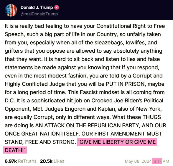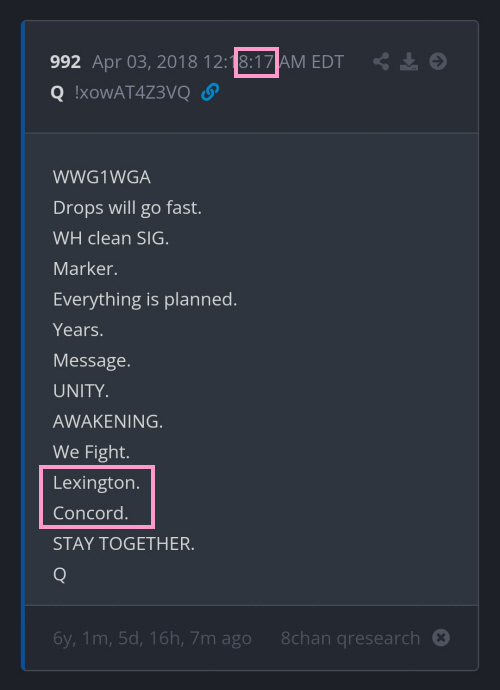 Trump posted the above at 8:17 Then, if we search the Q posts for time stamp 8:17, we find: ![]() If you look into the relevance of Trump's "Give me Liberty or Give me Death" quote: