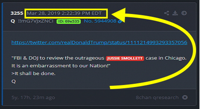 Q dropped this post on March 28, 2019 Then, five years later, to the day, this happens:
