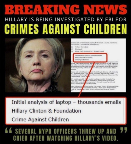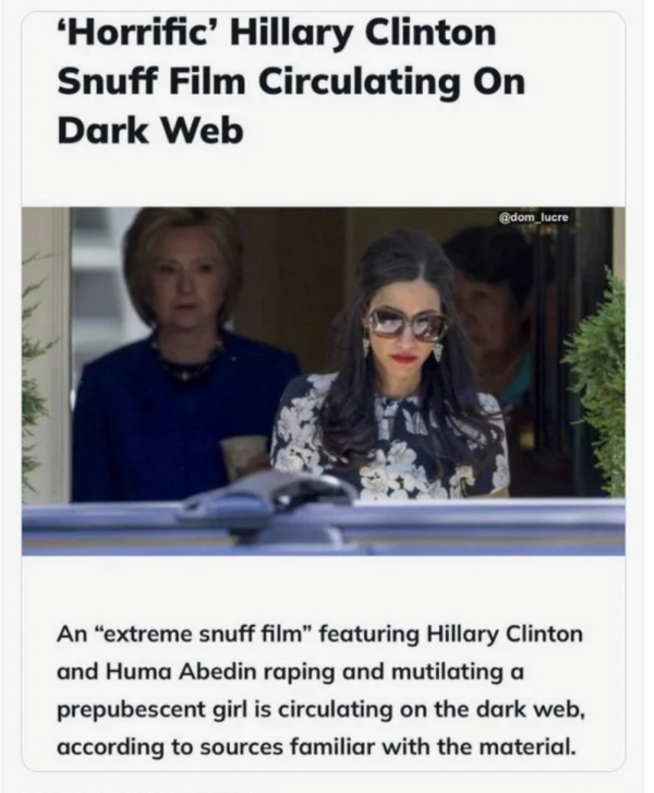 A Snuff Film is gross, it is a film showing a real person being brutally murdered and published on the "Dark Web" where people pay to watch it. Here is what is said to have been uncovered: When Anthony Weiner was arrested, his laptop was confiscated. Allegedly, on the laptop, there was a folder named "Life Insurance Policy," which held a video. The alleged video was a Snuff Video. It is said that four police officers opened the video, watched it, and came out of the room throwing up. The FBI confiscated the laptop, and mysteriously, all four officers died over the next few weeks in odd circumstances. Do you recall Adrenochrome and how it is obtained? It is a part of a satanic ritual. You can dig into this video further by searching for the term Frazzle Drip It is very sick. I do not recommend looking it up. It is alleged by some anons and online personalities that the video contains Huma and HRC engaging in a satanic ritual of child sacrifice to Moloch/Ba'al and extracting Adrenochrome.