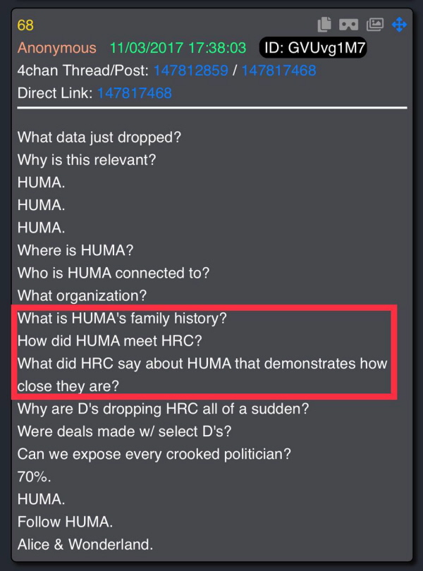 Q always calls Democrats "Ds." HRC is Hillary Rodham Clinton Huma is Huma Abedin, Hillary's Vice Chair of her 2016 Election Campaign, and she was married to Anthony Weiner. They divorced after Anthony was arrested for sending nude photos of himself to underage girls. Four years later, (4-Year Delta) Q-Drop 68 makes sense; Huma is interviewed on MSNBC, where she literally discusses her family history and relationship with Hillary. (3 minutes) Download this video: Right Click and select "Save Link As..." A Delta like this, which is so specific, causes the Anons to activate and put Huma under a microscope and draw attention to her. So, we follow Huma and see what she is up to. Back to this in a minute... There have been thousands of Q Deltas, some big, some small and usually several per week, and still continuing to this day (Jan 16, 2025). So why would Q create Deltas? Q created an army of Anons (Tens of Millions Strong) across the Earth. When Q focuses on something or someone, the Anons activate and flood social media with the news. This causes non-Anons (Normies) to become aware, and start the process of waking up to the Cabal illusion. The Q phenomenon is a massive Psy-Op by the White-Hat players to take down the Cabal. And the White Hats needed an army of digital soldiers to combat the main stream media narrative. Main stream would tell their illusion story, on all networks, to mislead the masses, and the Anon's would flood social media with meme's that pointed out how ridiculous the story is and how it could not possibly be true. An army of anonymous soldiers fighting the main stream media. Why did Q want us to focus on Huma? The following didn't come from Q but from Anon's researching into Huma. Which is what Q wanted, and what the world needed: