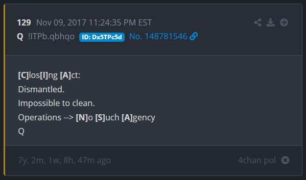 Anon's have been waiting since 2017 for the final act to play out. Dan is letting us know the Closing Act is upon us. Deep State has been dismantled and that it is impossible to clean completely but operations are under way by the NSA. Christopher Wray is/was the FBI Director under Biden. Trump supporters think he is corrupt and part of the Deep State. Anon's know better: