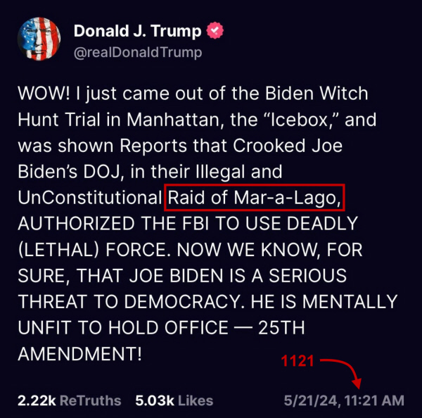 It was the beginning of the Revolutionary War. Trump is saying the war is about to intensify. There is definitely a correlation between pseudo-Musk's post and Trump's post, which ties back to a Q-Drop. Here is one that is a time-stamp nod. Take the time stamp and see if that Q post is relevant. Trump posted the following at exactly 11:21 pm, complaining about Biden attacking him using "Lawfare." Biden is using his Department of Justice and FBI to harass his political opponent.