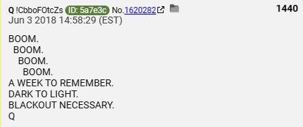 4 Points / 4 Booms Dark to Light 1:07 At the 1 minute 7 second mark in the video, there is a Dark to Light reference. But due to "Camouflaging" the video, the Dark to Light reference happens at 1:03 in the above video. Q called all of this out nine days before it happened. 9-day delta. Also, note the upper left corner of the image above. Posted by: Anonymous