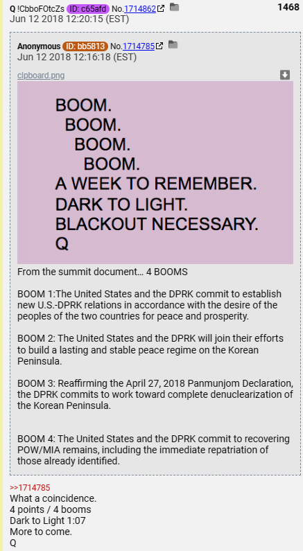 The words are formed in the shape of an upside-down pistol. Four BOOMs make up the pistol grip. A week to remember Dark to Light Blackout Necessary Nine days later, Donald Trump and Kim Jong-un signed a document committing to four goals. During Trump's visit to North Korea, he showed Kim Jong-un a video that Trump's team had made to help convince him to work with the Great Awakening team and eliminate the Cabal. Here is that video: (4 minutes) Download this video: Right Click and select "Save Link As..." An Anon replied to Q's post above after doing some research, hoping to have Q confirm if he was right. Based on Q's response, the Anon was correct.