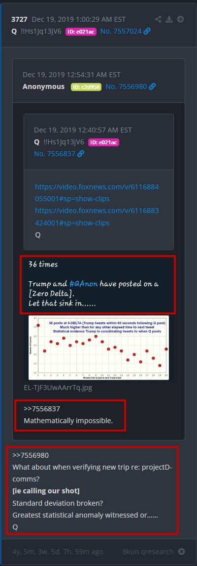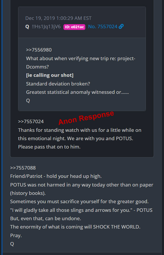 Upon study of the graph above, it is clear that Trump performed over 500 Reverse Deltas before the end of 2019. And all were 20 minutes or less Deltas. The above happened on December 19, 2019. That day, Trump was impeached for the first time. The Anon responds back to Q: