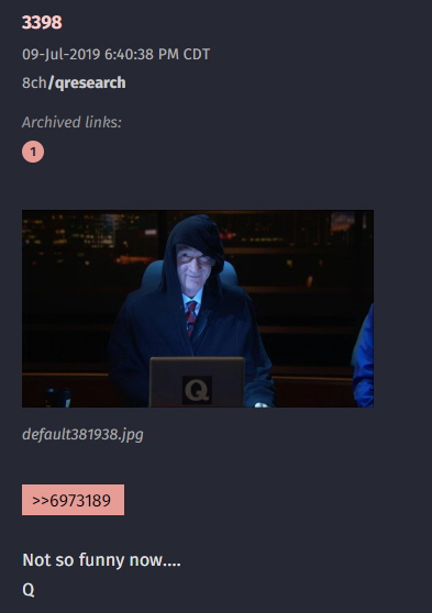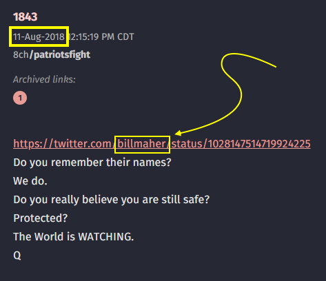 Anons believe that Q is asking Bill Maher if he remembers the names of the children he has raped, and asks him if he feels safe⦠Then, in 2019, Q posts this: