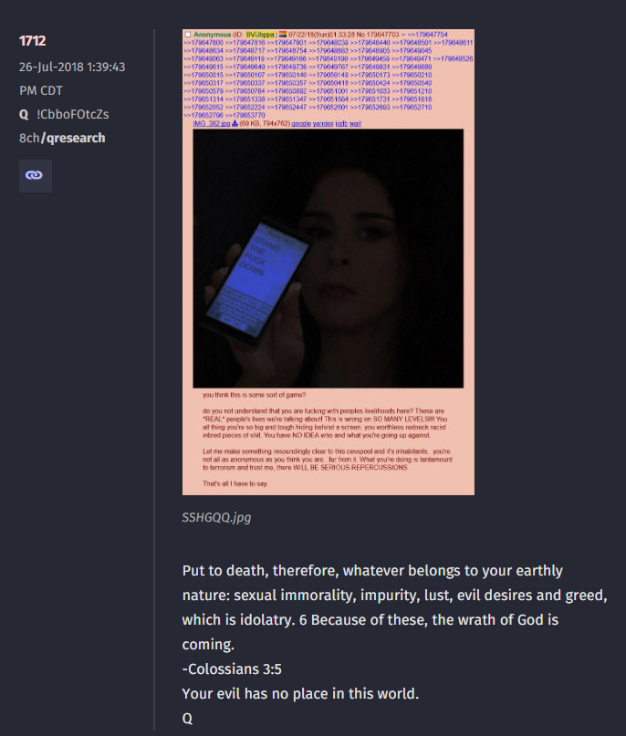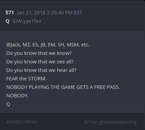 Read the full article here: Wayfair: The false conspiracy Trump knew back in 2012. His purposeful misspelling of children revealed this. Q warned about child trafficking and ritualistic satanic sacrificing of children. One of Trump's first executive orders put together a task force to abolish child trafficking, rescue children, arrest traffickers... and finally, cut off the Adrenochrome supply. Trump appointed Tim Ballard (Sound of Freedom) to head up this task force. Meet Tim Ballard An age old war tactic is to cut off the enemy's supply line. Trumps actions saved and returned home tens of thousands of children worldwide. The mainstream media remained silent. Download this video: Right Click and select "Save Link As..." In addition, Trump put laws into place that confiscate sex traffickers' money (all of it) and give it to a fund that provides recovery services for the victims. With the Adrenochrome supply cut off, those who are addicted become unglued and expose themselves. The Anons needed to be ready to witness this, to know what to look for, and to document and expose it. The Q-Group prepared the people, the Anons. Things are moving toward the storm. As Q continued to wake the public, the Cabal tried to threaten Q by posting the following to Q: