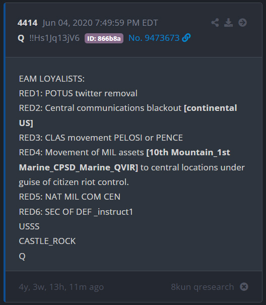 This is the USA, how did they get away with that? (21 minutes) Download this video: Right Click and select "Save Link As..." If you have viewed these pages in order, then you are familiar with Devolution. A method by which the military can take back our government if it were to be infiltrated by foreign actors. On June 4, 2020 (7 month Delta) Q predicted that Trump (POTUS) would be removed from Twitter.