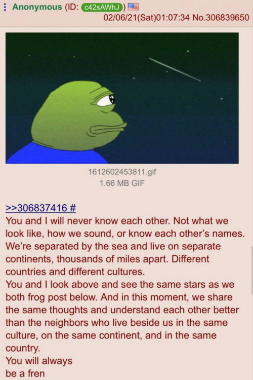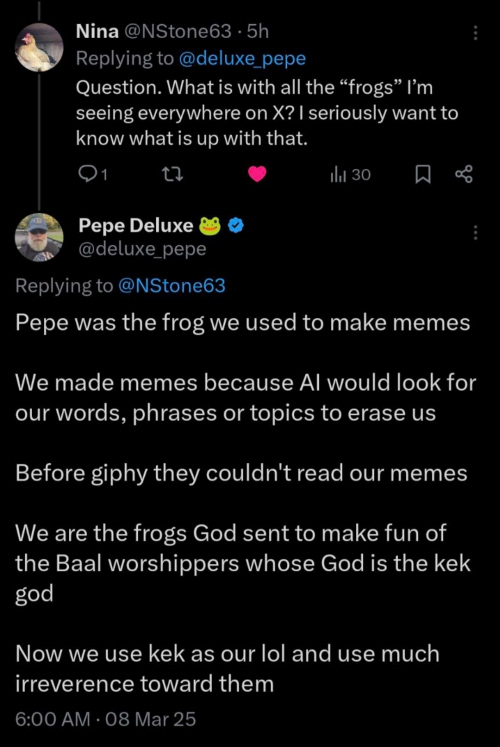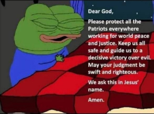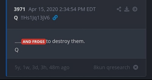 If you refuse to let my people go, I will send a plague of frogs on your whole country. The Nile will teem with frogs. They will come up into your palace and your bedroom and onto your bed, into the houses of your officials and on your people, and into your ovens and kneading troughs. (Exodus 8:2-3) Anons are likened to "An Army of Frogs" in the manner mentioned in Exodus. army of Anons, Tens of Millions strong.