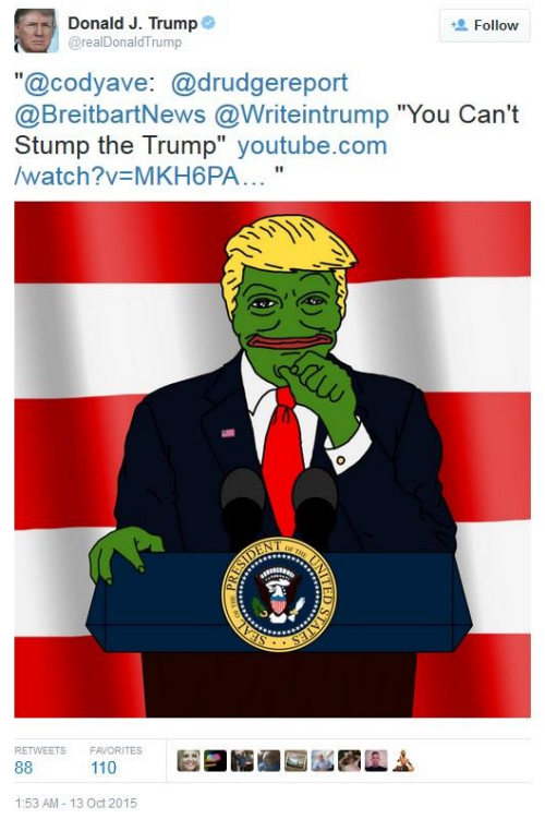 On October 13th, 2015, Donald Trump tweeted an illustration of Pepe as himself standing at a podium with the President of the United States Seal. Within 16 months, the post gathered upwards of 11,000 likes and 8,100 retweets.
