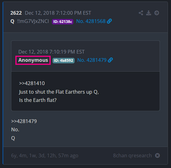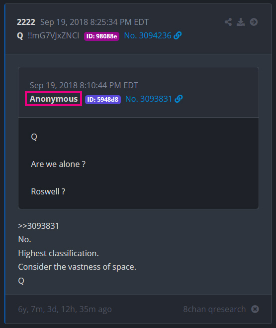 An Anon asks Q, "Are we alone? Roswell?" And Q responds, "No." So we are not alone, and there are space aliens... Or could it be something else?