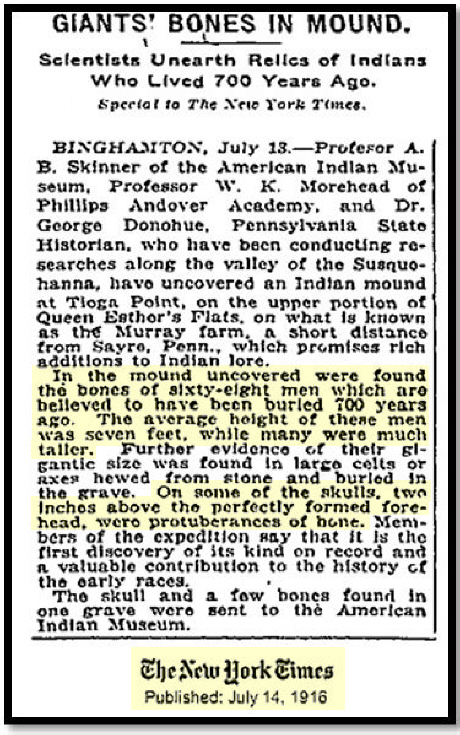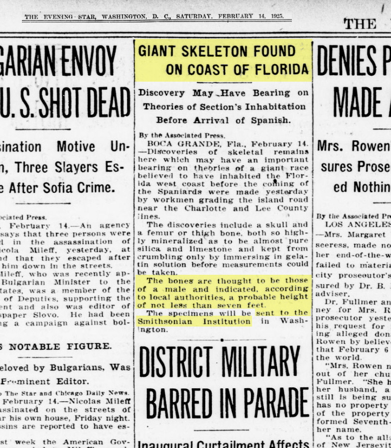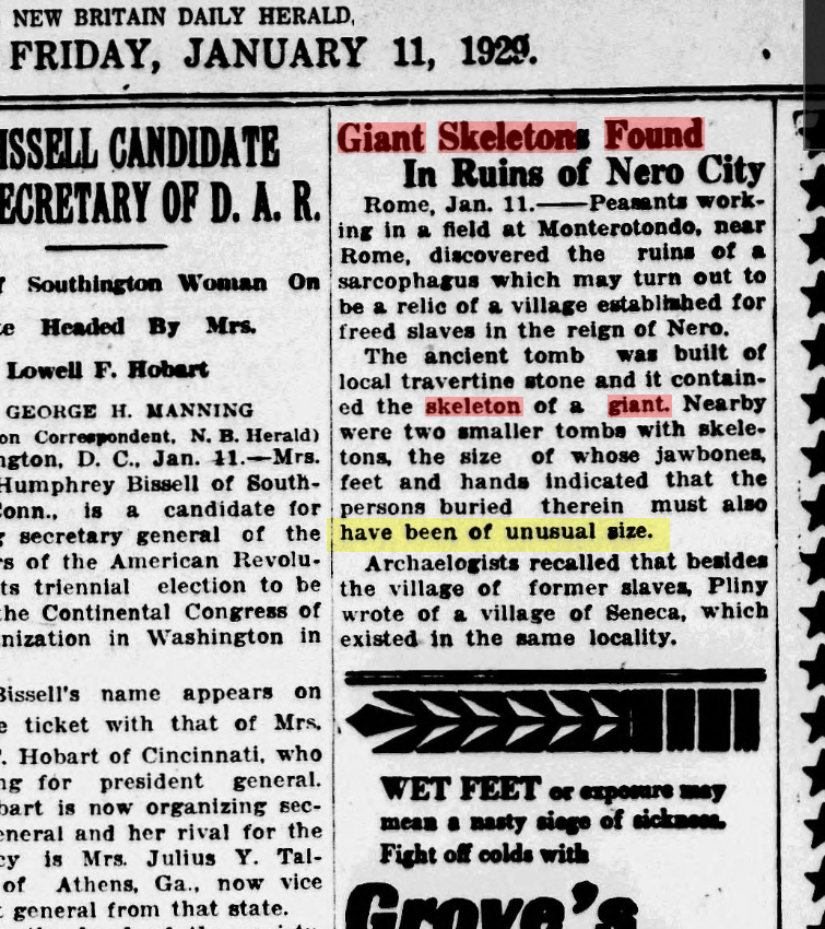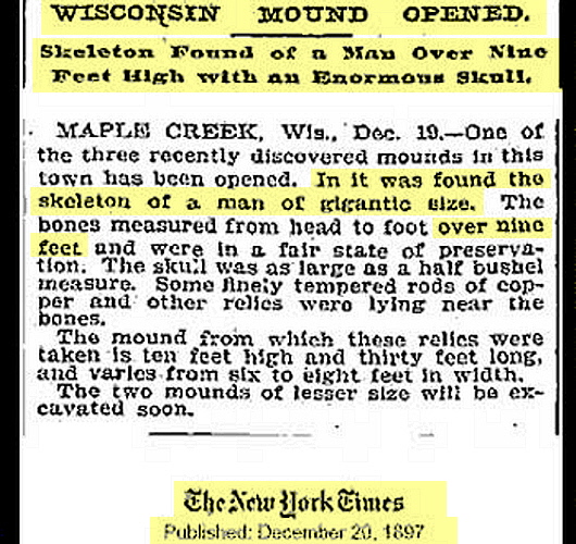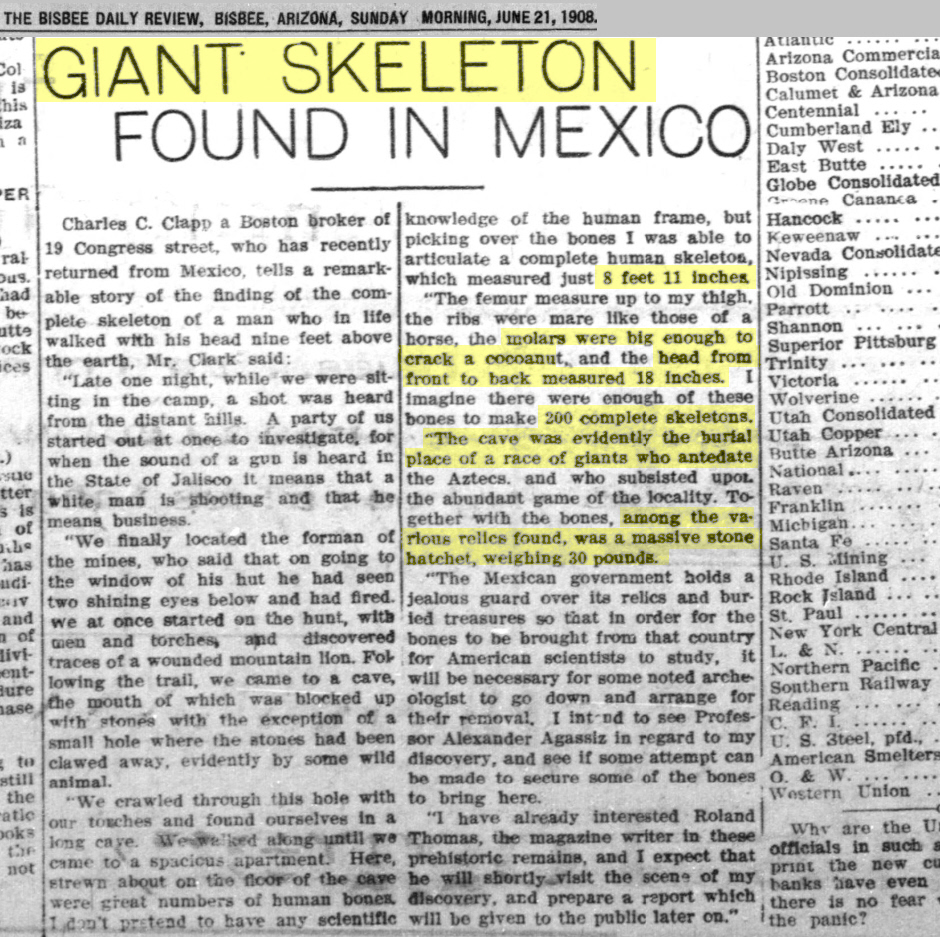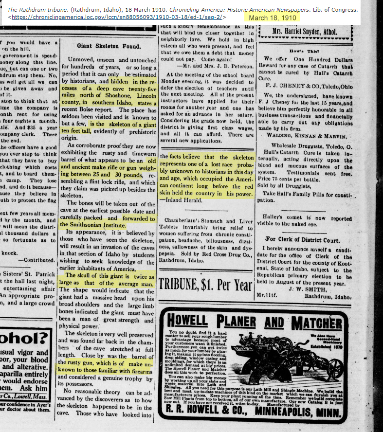 The following clippings were found at the Library of Congress, which allows searching through digitized old newspapers using search terms such as: "Giant Skeleton Found." You can see for yourself here: chroniclingamerica.loc.gov