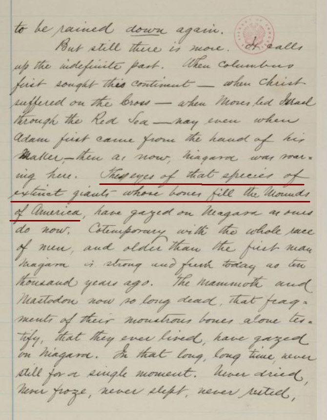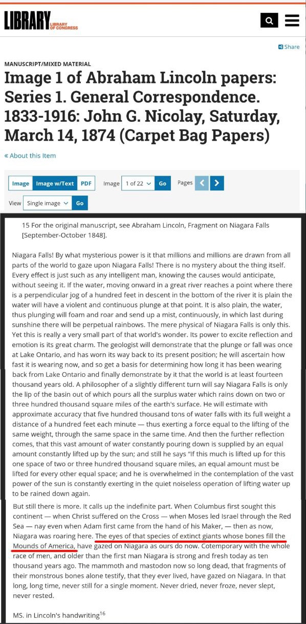 (17 Second Video) Download this video: Right Click and select "Save Link As..." You can view the following, for yourself, at the Library of Congress: https://www.loc.gov/resource/mal.4167500/?sp=14&st=text&r=-0.179,0.207,1.711,1.077,0 Abraham Lincoln once visited Niagara Falls and, in his own hand, wrote the following in his journal: The eyes of that species of extinct giants whose bones fill the mounds of America, have gazed on Niagara as ours do now.
