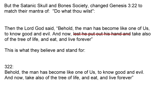 They see this as their guiding commandment: Take from the tree of life (blood, life essence) and eat it, and live forever. They completely ignore Genesis 3:23, where God cast man out of the Garden... They believe they should work toward living forever and be the gods they were meant to be. Adrenochrome (blood from the young) is one way of living longer. Another way is to use technology. If you think about it, they have no choice but to try and live forever. They know when they die, they will become nothing, at the very least. At the worst, they will be cast away and separated from God for an eternity.