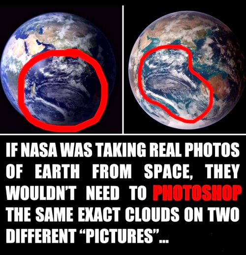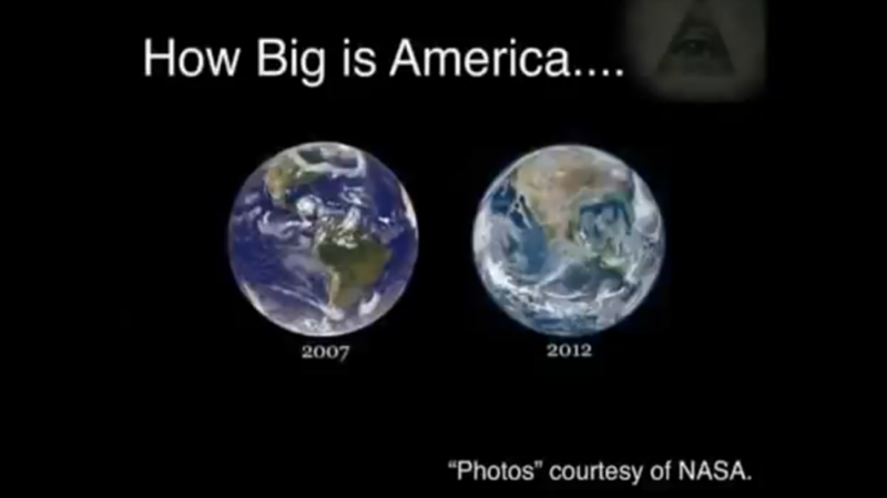 Flat Earthers believe the spacewalks and the space station are filmed on movie sets, using state-of-the-art special effects. Following is an example of how this could be done: (1 minute 51 seconds) Download this video: Right Click and select "Save Link As..." NASA posted official pictures of the Earth from space. Note the difference from 2007 to 2012. How did North America get bigger?