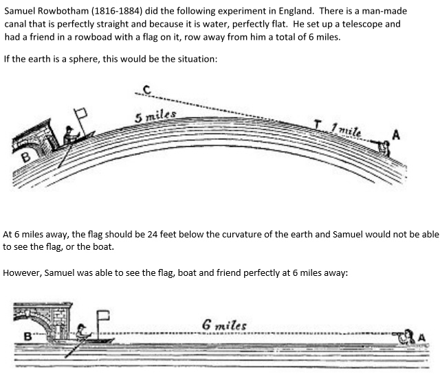You can experiment with this yourself the next time you are out in a boat or on the shore of a lake where the distance across is known. Let's say you are standing on the shore and know the lake is 6 miles across. You should not be able to see anything across the lake that is shorter than 24 feet tall. Single-story houses are around 14 feet tall, and two stories are around 23 to 26 feet tall. See what you see the next time you have this opportunity. If you can see a boat tied to a dock on the other side of a 6-mile lake, the Earth might be flat. Use a telescope or binoculars.
