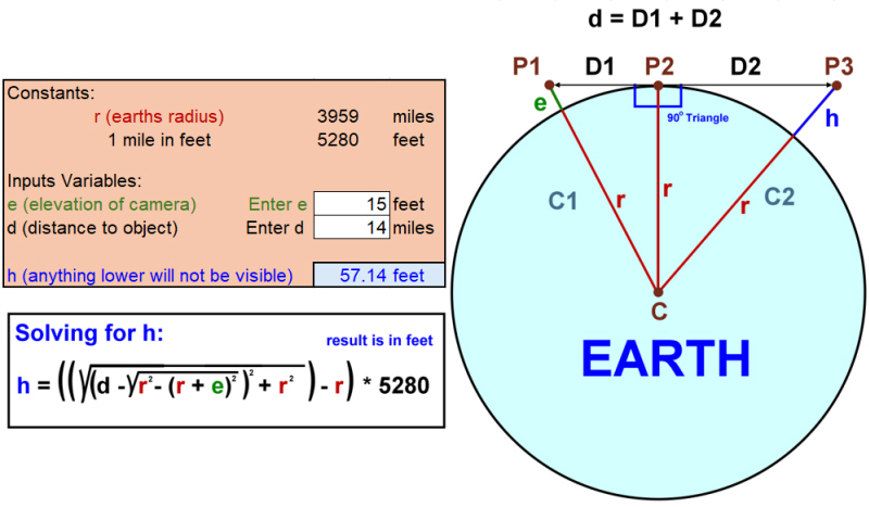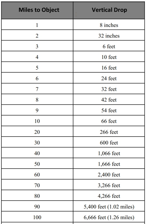 Note: We get the Earth's radius (3,959 miles) from NASA. Example: Let's say you are using a telescope on a tripod at location P1, and the telescope is 6 feet off the ground, e = 6, which needs to be added to the Earth's radius for the equation. The equation then calculates the height of 'h' at P3. Anything shorter than 'h' will not be visible through the telescope. The result of this math produces the following table, where "Miles to Object" is the distance between P1 and P3. Vertical drop is the height of 'h.' Everything shorter than the Vertical Drop, will not be visible as it is hidden behind the curvature of the Earth. Note: The following table assumes the observer is looking across water and their eyes are at water level, where variable 'e' above is zero.