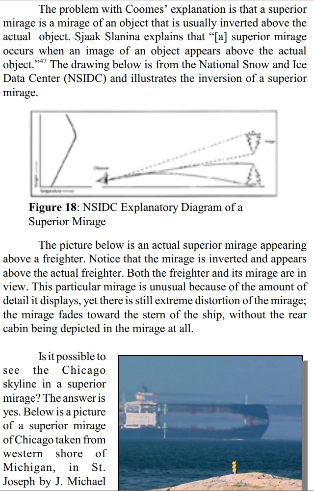 After Tom Coomes said Joshua's photo was only a mirage on the nightly news, Joshua did a second experiment. This time using a video camera for hours. Superior Mirages are rare, and when they happen, it is usually due to a temperature inversion above the water, creating a prism effect. These usually only last for a few minutes. Same Photographer (but from a different park in Michigan) (70 seconds) Download this video: Right Click and select "Save Link As..." People began replicating this experiment across the Earth and posting their videos online. It has since become an unofficial contest to try and beat the previous world record holder for distance filmed. Israel to the island of Crete is 616 miles away. The island should be 45 miles below the curve of the Earth and not at all visible if the Earth were a globe. (5 minutes) Download this video: Right Click and select "Save Link As..." How do you and I know these people are not pranking us? Photoshop and video-effect software are readily available and all of this could be faked. Who is telling the truth? NASA? These Amateurs? It is hard to know what the truth is. Personally witnessing and viewing the Earth from outer space is impossible for me and 99.9999% of Earth's population. I had to find out for myself, and I conducted a similar experiment 14 miles across a frozen lake. Not nearly as majestic or glamorous as the Chicago footage, but I was able to duplicate the experiment. My results are in the video below. (4 minutes) Download this video: Right Click and select "Save Link As..." Only a Straight Line