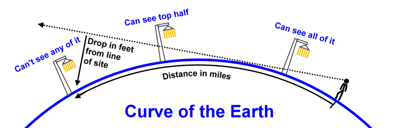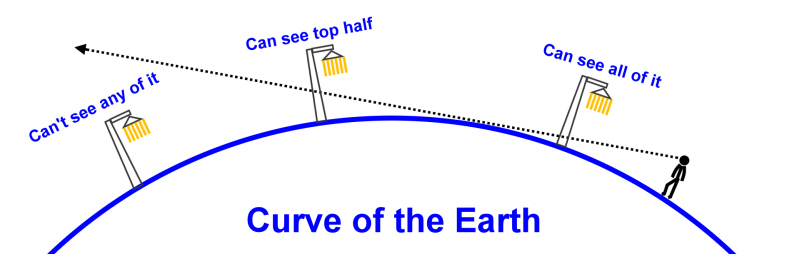 (40 Seconds) Download this video: Right Click and select "Save Link As..." An issue that exists with all of this is how can we individuals determine for ourselves what the truth is? We are relying on what trusted authorities have told us for many years. Have NASA, TV, and schools fed us lies? You and I can't clear this up by simply getting in a rocket, blasting into space, and look out the window to see a globe floating in space for ourselves. But there is another way. We can do a little experiment across a body of water and test the curvature of the Earth. In the image below, the person standing has a line of sight that the curve of the Earth will block. The streetlight closest to him is fully visible. Streetlights that are further away are hidden behind the curve, and cannot be seen: